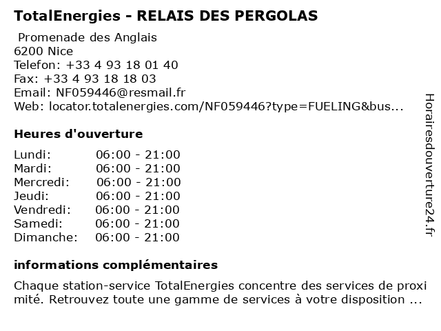 1 TotalEnergies - STATION NICE GRAND SOLEIL (Distance: 1,42 km) 61 BD. NAPOLEON 3, 06200 NICE gas station, grand, nice, soleil, station, station service, tankstelle, total, totalenergies 2 TotalEnergies - RELAIS NICE PR.D.ANGLAIS (Distance: 1,63 km) 217 PROMENADE DES ANGLAIS, 06200 NICE gas station, nice, pr.d.anglais, relais, station service, tankstelle, total, totalenergies 3 TotalEnergies - RELAIS DE GAULLE (Distance: 2,77 km) 702 . AVENUE GENERAL DE GAULLE, 06700 ST LAURENT DU VAR de, gas station, gaulle, relais, station service, tankstelle, total, totalenergies 4 TotalEnergies - GARAGE UNIVERSEL (Distance: 4,23 km) 1519 Avenue Pierre et Marie Curie, 06700 Saint-Laurent-du-Var garage, gas station, station service, tankstelle, total, totalenergies, universel 5 TotalEnergies - RELAIS PARC IMPERIAL (Distance: 4,35 km) 29 BIS, AV PAUL ARENE, 06000 NICE borne de recharge, charging station, imperial, parc, recharger ma voiture, relais, totalenergies 6 TotalEnergies - RELAIS VAL FLEURI (Distance: 4,50 km) 49 CHEMIN DU VAL FLEURI, 06800 CAGNES SUR MER fleuri, gas station, relais, station service, tankstelle, total, totalenergies, val |
