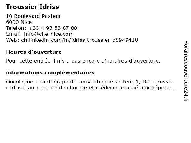 1 Dr Idriss Troussier - Onco-radiothérapeute (Distance: 3,20 km) 28 Boulevard du Tzarewitch, 06000 Nice consultation, docteur, dr, idriss, med, médecin, médecine, onco, radiothérapeute, traitement, troussier |