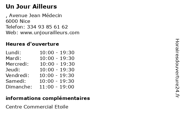 1 Un Jour Ailleurs (Distance: 7,32 km) - Avenue Eugène Donadeï, 06700 Saint-Laurent-du-Var ailleurs, beaute&sante, bijoux, chausures, decoration, jour, mode enfants, mode femmes, mode hommes, optique, restaurant, sport, un 2 Un Jour Ailleurs (Distance: 17,68 km) 55 Rue de la République, 06600 Antibes accessoires, ailleurs, jour, mode, un, vetements 4 Vétérinaire à Domicile Un Véto Chez Vous (Distance: 1,23 km) - Avenue du Docteur, 06000 Nice affaires, chez, clinique, domicile, produit, service, un, veterinaire, vous, véto, vétérinaire 5 UN DELICE (Distance: 1,28 km) 22 Rue Barla, 06000 Nice cuisine gastronomique halal, delice, repas halal, restaurant cuisine halal, restaurant gastronomique halal, restaurant halal, restaurant halal 06, restaurant halal côte d'azur, restaurant halal nice, restauration halal, un 6 |