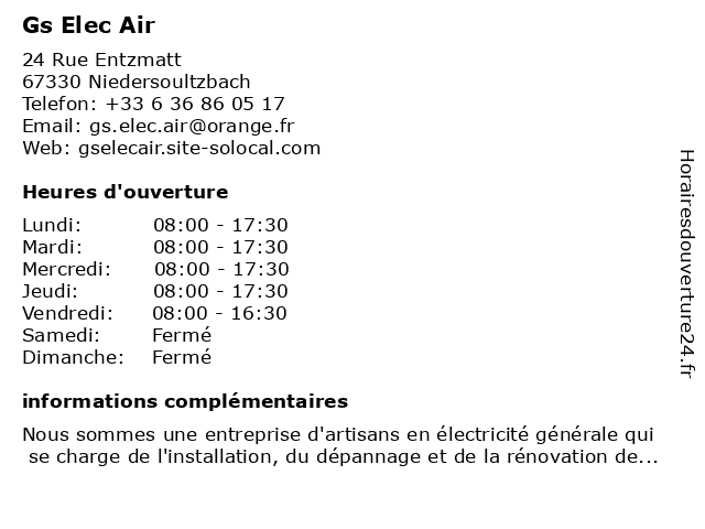 1 Un Air De Campagne (Distance: 8,66 km) 3 Rue Des Vergers, 67350 Ringendorf air, campagne, de, hebergement, restaurants, un 4 VAP ELEC SHOP (Distance: 21,61 km) 25 bis Rue de la Sablière, 67590 Schweighouse-sur-Moder elec, shop, vap 5 Garage GS Auto Service - 1,2,3 AutoService (Distance: 33,82 km) 3 Rue de l'Industrie, 67660 Betschdorf auto, autoservice, garage, gs, service 6 Led Elec (Distance: 35,62 km) 11 Rue Kageneck, 67000 Strasbourg depannage, elec, led, mise au normes de vos luminaires, rénovation |