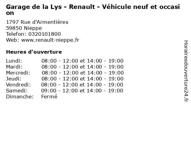 1 Garage de la Lys - Renault - Véhicule neuf et occasion (Distance: 10,71 km) 3 rue du Hem Prolongée, 59320 Englos atelier, automobile, concessionnaire, de, et, garage, la, lys, neuf, neuve, occasion, renault, réparation, vente, véhicule 2 Garage de la Lys - Renault - Après vente (Distance: 0,00 km) 1797 rue d'Armentières, 59850 Nieppe après, atelier, automobile, concessionnaire, de, garage, la, lys, neuve, occasion, renault, réparation, vente 3 Garage de la Lys - Renault - Pièces de rechange (Distance: 0,00 km) 1797 rue d'Armentières, 59850 Nieppe atelier, automobile, concessionnaire, de, garage, la, lys, neuve, occasion, pièce, pièces, rechange, renault, réparation, vente 4 Renault - Borne de Recharge Electrique (Distance: 0,03 km) 1797 Rue d'Armentières, 59850 Nieppe borne, de, electrique, recharge, renault, électrique 5 Les Gourmet De La Lys (Distance: 0,40 km) Stachera , 59850 Nieppe gourmet, jean, lys, marie, restaurants, stachera 6 Peugeot (Véhicule d'occasio) (Distance: 0,43 km) 29 Avenue Pierre Brossolette, 59427 Armentieres automobiles, concéssionnaire, d'occasio, garage, motos, peugeot, véhicule |
