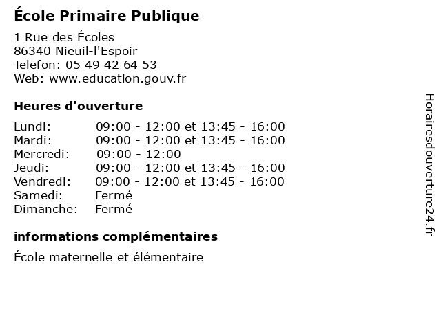1 École Primaire Publique (Distance: 4,09 km) 15 Rue des Écoles, 86340 Nouaillé-Maupertuis cours, education, primaire, publique, services, École, école 2 École Primaire Publique (Distance: 5,05 km) . Rue du Château, 86340 Vernon cours, education, primaire, publique, services, École, école 3 École Primaire Publique (Distance: 5,22 km) 13 Route de Nieuil, 86340 Gizay cours, education, primaire, publique, services, École, école 4 École Primaire Publique (Distance: 5,95 km) 62 Place de la Mairie, 86800 Savigny-Lévescault cours, education, primaire, publique, services, École, école 5 École Primaire Publique (Distance: 10,87 km) 3 Rue d'Aigne, 86240 Iteuil cours, education, primaire, publique, services, École, école 6 École Primaire Publique (Distance: 12,31 km) 12 Route de Verrières, 86410 Lhommaizé cours, education, primaire, publique, services, École, école |