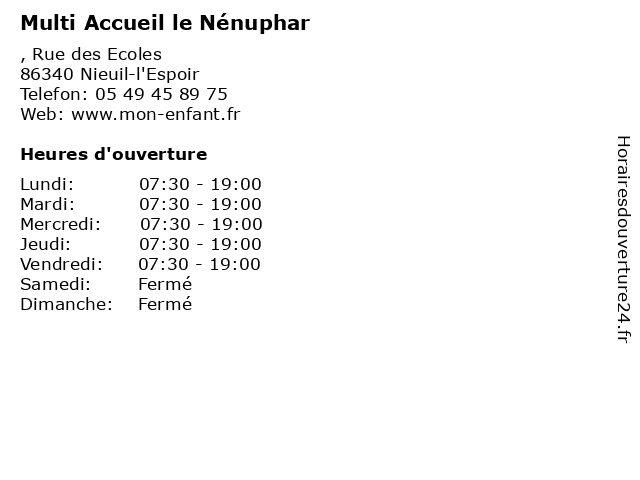 | Lundi | 07:30-19:00 |