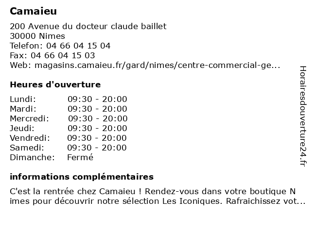 1 Jules Nîmes (Distance: 0,02 km) Centre Commercial Géant Cap Costières, 30000 NIMES jules, magasin de smokings, magasin de t-shirts, magasin d’accessoires de mode, mode, nîmes 2 Brice Nimes (Distance: 0,13 km) Centre Commercial Cap Costieres, 30000 NIMES brice, magasin de smokings, magasin de t-shirts, magasin d’accessoires de mode, mode, nimes 3 Z Generation (Distance: 2,83 km) 10/14 rue de La Madeleine, 30000 Nimes accessories, children 0-14 years, clothing, coats, dresses, generation, hoodies, jackets, jeans pants, pajamas, shirts, shoes, skirts, sweatshirts, t-shirts 4 Jules Beaucaire - Fermeture définitive (Distance: 20,21 km) Lieu Dit Genestet, 30300 BEAUCAIRE beaucaire, définitive, fermeture, jules, magasin de smokings, magasin de t-shirts, magasin d’accessoires de mode, mode 5 Camaieu (Distance: 20,27 km) Route de nîmes, 30300 Beaucaire camaieu, magasin de chaussures, magasin de t-shirts, magasin d’accessoires de mode, maroquinerie, mode 6 Camaïeu (Distance: 31,65 km) - Route de Nîmes, 34400 Lunel boutiques, camaïeu, clothings, pants, shirts |