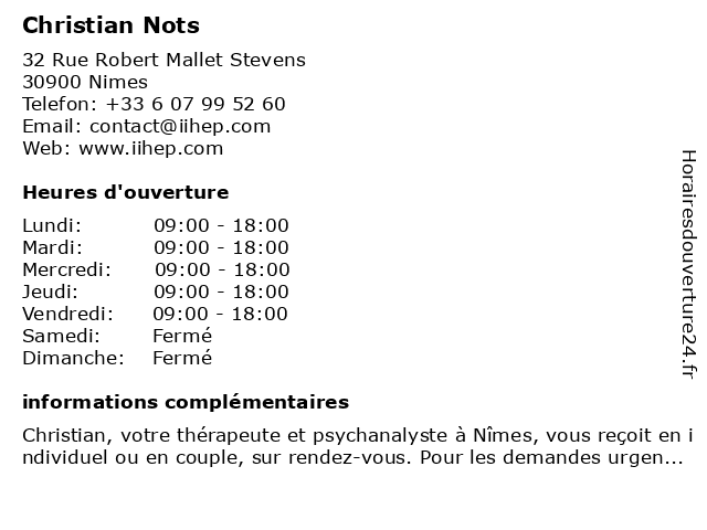 1 Dr Christian Leonardi - Chirurgien orthopédiste (Distance: 2,15 km) 125 avenue Kennedy, 30900 Nimes chirurgien, christian, consultation, docteur, dr, leonardi, med, médecin, médecine, orthopédiste, traitement 2 Théâtre Christian Liger (Distance: 2,18 km) - rue du Cirque Romain, 30900 Nimes christian, danse, humour, liger, musique, théâtre, théâtre christian liger 3 Jauffret Christian (Distance: 2,43 km) Route De Nimes, 30450 Genolhac christian, jauffret, restaurants 4 Christian Barnouin - Avocat (Distance: 2,66 km) 6 avenue Général Leclerc, 30000 Nîmes avocat, barnouin, christian, droids, justice, maître 6 |