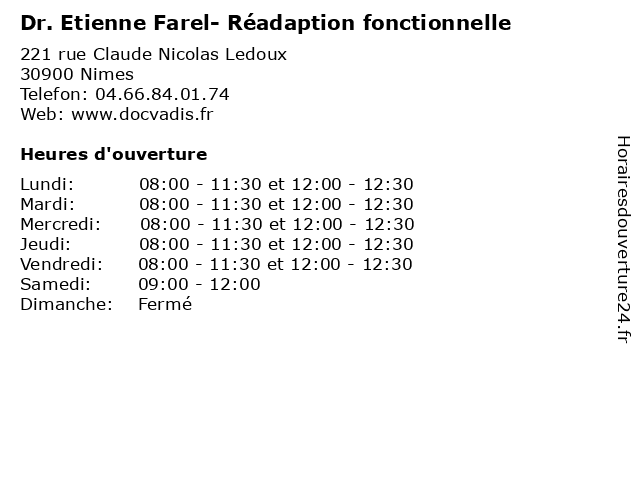 1 Dr. Etienne Farel- Réadaption fonctionnelle (Distance: 0,00 km) 221 rue Claude Nicolas Ledoux, 30900 Nimes consultation, docteur, dr., etienne, farel, fonctionnelle, réadaption, santé 3 Dr Etienne Boutry - Chirurgien général (Distance: 1,97 km) 4 Rue du Professeur Robert Debré, 30900 Nîmes boutry, chirurgien, consultation, docteur, dr, etienne, général, med, médecin, traitement 4 Dr Jean-Etienne Ricci - Cardiologue (Distance: 2,35 km) 4 rue du Professeur Robert Debré, 30029 Nîmes cardio, cardiologie, cardiologue, centre, coeur, dr, etienne, hospitalier, jean, nîmes, ricci 5 Bosc Mathieu Etienne Octave (Distance: 2,81 km) Aux Legumes Gourmands, 30900 Nimes bosc, etienne, mathieu, octave, restaurants 6 École maternelle publique Pompidou Pic d'Etienne (Distance: 13,81 km) . Place du Général Leclerc, 30600 Vauvert cours, d'etienne, education, etienne, maternelle, pic, pompidou, publique, services, école |