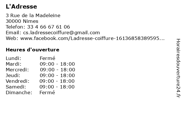 1 Agence immobilière l'Adresse Nîmes Boulevard de la Libération (Distance: 0,29 km) 1 Boulevard de la Libération, 30000 Nîmes agence, boulevard, de, immobilière, l'adresse, la, libération, nîmes 2 Agence immobilière l'Adresse Nîmes Boulevard de la Libération (Distance: 0,29 km) 1 Rue de la Couronne, 30000 Nîmes agence, boulevard, de, immobilière, l'adresse, la, libération, nîmes 3 Agence immobilière l'Adresse Nîmes Mont Duplan (Distance: 0,42 km) 1 Avenue du Mont Duplan, 30000 Nîmes agence, duplan, immobilière, l'adresse, mont, nîmes 4 Comptoir National de l'Or Nîmes (CHANGEMENT D'ADRESSE) (Distance: 0,79 km) 23 Rue Emile Jamais, 30000 Nimes changement, comptoir, d'adresse, de, l'or, national, nîmes 5 Agence immobilière l'Adresse Marguerittes (Distance: 7,07 km) 22 Avenue de Provence, 30320 Marguerittes agence, immobilière, l'adresse, marguerittes 6 Agence immobilière l'Adresse Vauvert (Distance: 18,06 km) 145 Avenue de la Condamine, 30600 Vauvert agence, immobilière, l'adresse, vauvert |