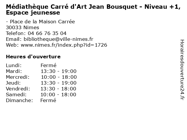1 Médiathèque Carré d'Art Jean Bousquet - vacances scolaires (Distance: 0,00 km) - Place de la Maison Carrée, 30033 Nimes bousquet, carré, cd, d'art, dvd, jean, livres, médiathèque, revues, scolaires, vacances 2 Bibliothèque Carré d'Art (Jeunesse) (Distance: 0,03 km) . Place de la Maison Carrée, 30000 Nimes bibliothèque, carré, d'art, jeunesse, livre, médiathèque, services 3 Bibliothèque Carré d'Art (Adultes) (Distance: 0,03 km) . Place de la Maison Carrée, 30000 Nimes adultes, bibliothèque, carré, d'art, livre, médiathèque, services 4 Librarie-Carre D'Art (Distance: 0,06 km) 16 Place de la Maison Carrée, 30000 Nimes bibliothèque, carre, d'art, libraire, librarie, livre, médiathèque, services 5 Médiathèque Carré d'Art Jean Bousquet (Distance: 0,09 km) - Place de la Maison Carrée, 30033 Nimes bousquet, carré, cd, d'art, dvd, jean, livres, médiathèque, revues 6 Médiathèque Carré d'Art Jean Bousquet-Horaires d’été (Distance: 0,09 km) - Place de la Maison Carrée, 30033 Nimes bousquet, carré, cd, d'art, dvd, d’été, horaires, jean, livres, médiathèque, revues |