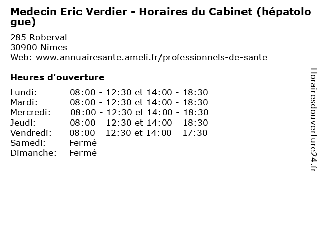 Termes de recherche pour Medecin Eric Verdier - Horaires du Cabinet (hépatologue):du, horaires, cabinet, services, eric, santé, verdier, docteur, médecin, hépatologue |