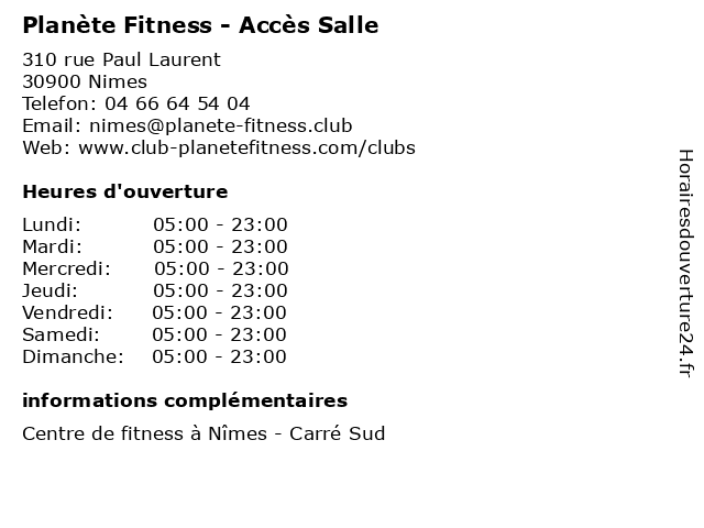 1 Planète Fitness - Accès Salle (Distance: 2,66 km) 76 Avenue Jean Jaurès, 30900 Nîmes accès, business, centre, fitness, gym, planète, salle, santé 2 Planète Fitness - Accès Salle (Distance: 3,06 km) 243 rue du Pied Ferme, 30900 Nimes accès, club, fitness, musculation, planète, salle, sport 3 Planète Fitness - Accueil (Distance: 0,00 km) 310 rue Paul Laurent, 30900 Nimes accueil, club, fitness, musculation, planète, sport 4 Planète Fitness - Accueil (Distance: 2,66 km) 76 avenue Jean Jaurès, 30900 Nimes accueil, club, fitness, musculation, planète, sport 5 Planète Fitness - Accueil (Distance: 3,06 km) 243 rue du Pied Ferme, 30900 Nimes accueil, club, fitness, musculation, planète, sport 6 Hôtel Best Western - Accès et réception (Distance: 3,53 km) 21 Rue Nationale, 30000 Nîmes accès, best, et, hebergement, hotel, hôtel, réception, western |