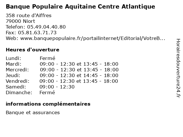 1 Banque Populaire Aquitaine Centre Atlantique (Distance: 2,77 km) 580 avenue de Paris, 79000 Niort aquitaine, atlantique, banque, centre, populaire 2 Banque Populaire Acquitaine Centre Atlantique (Distance: 1,94 km) 358, route d'Aiffres, 79000 Niort acquitaine, assurances, atlantique, banque, centre, du, grand, ouest, populaire, sud 3 Banque Populaire (Distance: 2,66 km) 10 avenue Bujault, 79000 Niort agence, assurance, bancaire, banque, populaire 4 Socram Banque (Distance: 2,85 km) 2 Rue du 24 Fevrier, 79000 Niort banque, banques, commerciales, nationales, socram 5 CASDEN Banque Populaire (Distance: 2,94 km) 15 bis Place Saint Jean, 79000 Niort argents, banque, casden, conseils, offres, populaire, épargne 6 |