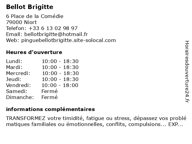 1 Bijou Brigitte (Distance: 0,21 km) 25 Rue Ricard, 79000 Niort accessoires, bijou, bijouterie, bijoux, brigitte, cadeaux, fantaisie 2 Dr Brigitte Faucher - Stomatologue (Distance: 1,09 km) 60 Route d'Aiffres, 79000 Niort brigitte, dentaire, dr, faucher, implantologie, parodontologie, stomatologue 4 Granados Granaods Brigitte Julie (Distance: 26,89 km) Chez Melle Carillo Laure, 69007 Lyon brigitte, granados, granaods, julie, restaurants 5 Agence Andrillon Brigitte (Distance: 54,61 km) 89 Avenue de Rompsay, 17000 La Rochelle agence, andrillon, brigitte 6 Brigitte Warnier de Wailly - Sage-femme (Distance: 55,60 km) 6 Rue des Vanneaux, 17140 Lagord brigitte, de, femme, médecins, médicaments, sage, santé, spécialiste, wailly, warnier |