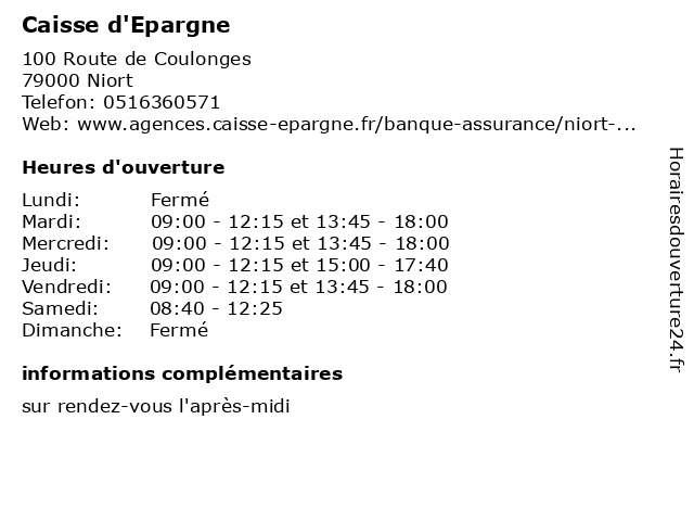 1 Caisse d'Epargne (Distance: 2,13 km) 24 Rue du 24 Février, 79000 Niort banque, caisse, carte, d'epargne, services 2 Caisse d'Epargne (Distance: 2,63 km) 224 avenue de Paris, 79000 Niort banque, caisse, carte, d'epargne, services 3 Caisse d'Epargne (Distance: 2,68 km) 69 Avenue de Limoges, 79000 Niort banque, caisse, carte, d'epargne, services 4 Caisse d'Epargne (Distance: 10,70 km) Place de l'Eglise, 79270 Frontenay-Rohan-Rohan banque, caisse, carte, d'epargne, epargne, services 5 Caisse d'Epargne (Distance: 13,49 km) 59 avenue de Paris, 79260 Crèche banque, caisse, carte, d'epargne, services 6 Caisse d'Épargne (Distance: 2,22 km) Rue de Pierre, 79000 Niort banque, caisse, carte, d'epargne, d'épargne, services |