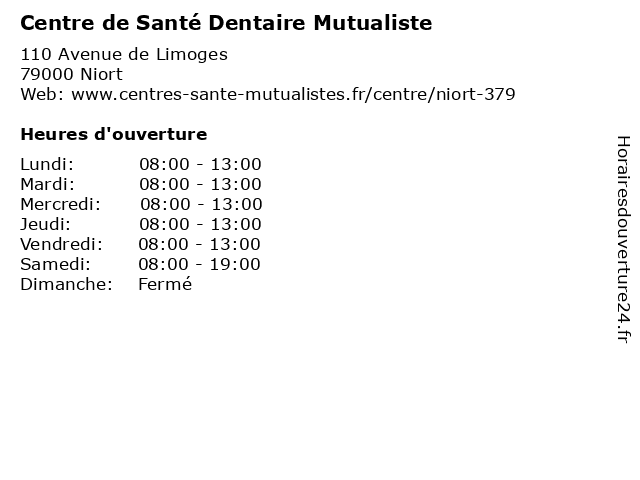 1 Centre De Santé Dentaire Mutualiste Niort (Distance: 0,07 km) 110 Avenue de Limoges, 79000 Niort centre, de, dentaire, mutualiste, niort, santé 2 Maison De Santé Du 110 (Distance: 0,08 km) 110 Avenue de Limoges, 79000 Niort 110, de, du, maison, santé 3 Melioris Centre de Santé Champclairot (Distance: 1,02 km) 32 Rue Sainte-Catherine, 79000 Niort centre, champclairot, de, melioris, santé 4 Cabinet Dentaire du Donjon (Distance: 1,25 km) 6 Rue De L'hotel De Ville, 79000 Niort cabinet, dentaire, donjon, du 5 Agence régionale de santé (ARS) - Délégation départementale - Deux-Sèvres (Distance: 1,38 km) 6 rue de l'Abreuvoir, 79025 Niort administration, agence, ars, de, deux, délégation, départementale, organismes, publics, régionale, santé, services, sèvres 6 |