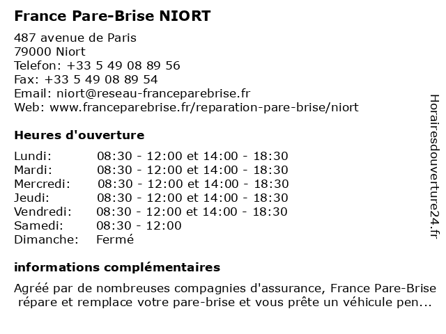 | 1 France Pare Brise (Distance: 0,01 km) 487 Avenue de Paris, 79000 Niort bris de glace, brise, france, pare, services 2 BH Pare Brise (Distance: 1,08 km) 6 Rue Jean Baptiste Colbert, 79000 Niort bh, bris de glace, brise, pare, pare brise, services 4 123 Pare-Brise Niort (Distance: 3,03 km) 437 Route de Paris, 79180 Chauray 123, 123 pare-brise, bris de glace, brise, calibrage caméra adas, carte cadeau, changement pare-brise, franchise offerte, lunette arrière, niort, pare, pare-brise, remplacement pare-brise, réparation pare-brise, toit panoramique, vitre latérale 5 Rapid Pare-Brise (Distance: 3,95 km) - Rue du Maquis Surcouf, 27500 Pont-Audemer auto, bris de glace, brise, centre, pare, pare brise, rapid, réparation 6 Rapid Pare-Brise (Distance: 4,00 km) 3 rue André Galle, 79000 Niort auto, bris de glace, brise, centre, pare, pare brise, rapid, réparation |