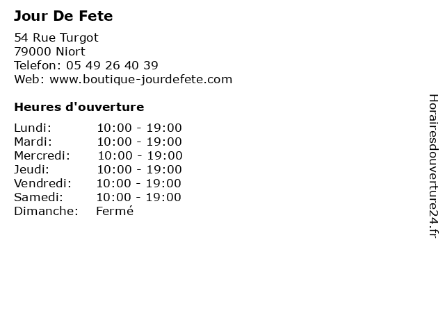 2 Jour de Fête (Distance: 0,59 km) 54 Rue Turgot,Espace Mendes France 1, 79000 Niort articles de fêtes, de, déco, déguisement, fête, jour, magasin, mariage, vaisselle 4 Fete Animation Restauration (Distance: 5,76 km) 109 Rue Du Temple, 79260 La Creche animation, fete, restaurants, restauration 5 JouéClub (Distance: 6,38 km) n/a ROUTE DE LA ROCHELLE, 79000 Niort - Bessines board games, constructions toys, educational games, jouéclub, kids, outdoor, puzzles, sports, toys 6 Eram (Distance: 23,94 km) 5 Rue Du Commandant Bernier, 79500 Melle accessories, bags, eram, kids, men, shoes, women |