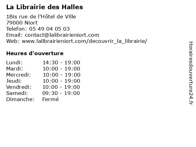 1 Marché des Halles à Niort (Distance: 0,02 km) n/a ville, 79000 Niort angers, brouilla, centre, des, eblé, fayette, frutas, halles, hortalizas, la, marché, mercado, niort, verduras, ville 2 Optik Des Halles (Distance: 0,09 km) 35 Rue Brisson, 79000 Niort des, halles, lentilles, lunettes, mag, opticien, opticien niort, optik, vision 3 Librairie l'Hydragon (Distance: 0,28 km) 15 rue des Cordeliers, 79000 Niort cd audio, cd.rom, l'hydragon, librairie, livres, revues 4 La Salaison Des Halles (Distance: 1,08 km) 1 b Impasse De La Blauderie, 79000 Niort boucheries, halles, poissonneries, salaison 5 La Librairie de la Mude (Distance: 3,21 km) 21 route de La Rochelle, 79000 Bessines culture, de, la, lecture, libraire, librairie, livres, mude 6 La Salaison Des Halles (Distance: 5,63 km) Halle Municipales, 79000 Niort boucheries, halles, poissonneries, salaison |