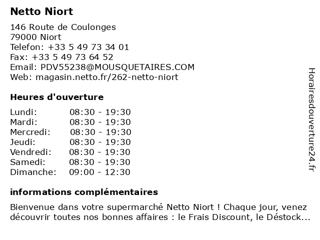 3 Netto (Distance: 52,69 km) - ZA de Beaulieu, 17138 Puilboreau achats de produits alimentaires, des prix bas, grands supermarchés, hard discount, netto, supermarchés 5 Netto Blanzac-lès-Matha (Distance: 53,83 km) 139 Route de Saint-Jean d'Angely, 17160 Blanzac-lès-Matha blanzac, lès, matha, netto 6 |