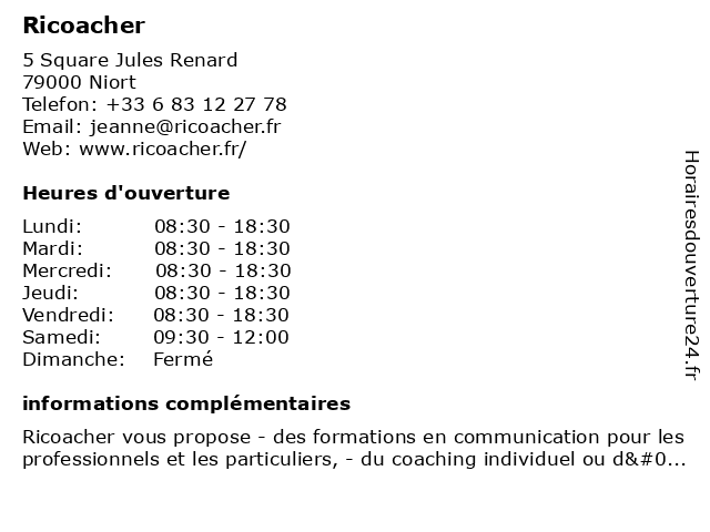 Ricoacher vous propose - des formations en communication pour les professionnels et les particuliers, - du coaching individuel ou d'équipe, - de la supervision pour coach et formateur L'établisse...