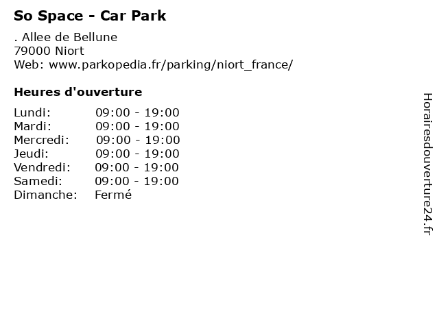 1 So Space - Car Park (Distance: 0,68 km) . Avenue de Paris, 79000 Niort automobile, car, park, parking, services, so, space 2 So Space - Car Park (Distance: 0,98 km) . Place Saint Hilaire, 79000 Niort automobile, car, park, parking, services, so, space 3 So Space - Car Park (Distance: 0,99 km) . Rue du 14 Juillet, 79000 Niort automobile, car, park, parking, services, so, space 4 So Space - Car Park (Distance: 1,02 km) . Place de la Comedie, 79000 Niort automobile, car, park, parking, services, so, space 5 So Space - Car Park (Distance: 1,06 km) . Parvis Saint-André, 79000 Niort automobile, car, park, parking, services, so, space 6 So Space - Car Park (Distance: 1,09 km) . Rue Basse, 79000 Niort automobile, car, park, parking, services, so, space |