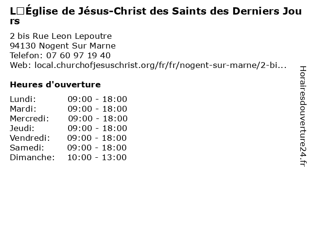 1 L’Église de Jésus-Christ des Saints des Derniers Jours (Distance: 7,45 km) 64 Rue De Romainville, 75019 Paris christ, de, derniers, des, jours, jésus, l’église, organisation religieuse, saints 2 L’Église de Jésus-Christ des Saints des Derniers Jours (Distance: 9,56 km) 2 bis Bd Westhinghouse, 93270 Sevran christ, de, derniers, des, jours, jésus, l’église, organisation religieuse, saints 3 L’Église de Jésus-Christ des Saints des Derniers Jours (Distance: 10,16 km) 12 Rue St Merri, 75004 Paris christ, de, derniers, des, jours, jésus, l’église, organisation religieuse, saints 4 L’Église de Jésus-Christ des Saints des Derniers Jours (Distance: 11,90 km) 9 Ave, 77200 Torcy christ, de, derniers, des, jours, jésus, l’église, organisation religieuse, saints 5 L’Église de Jésus-Christ des Saints des Derniers Jours (Distance: 13,55 km) 149 Boulevard Gabriel Peri, 92240 Malakoff christ, de, derniers, des, jours, jésus, l’église, organisation religieuse, saints 6 L’Église de Jésus-Christ des Saints des Derniers Jours (Distance: 13,84 km) 55 Boulevard Victor Hugo, 93400 St Ouen christ, de, derniers, des, jours, jésus, l’église, organisation religieuse, saints |