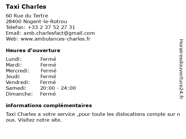 1 AMBULANCE TAXI J. MALNUIT (Distance: 0,53 km) 25 Rue Croix La, 28400 Nogent le Rotrou ambulance, j., malnuit, taxi 5 Taxi Charles Et Vassard (Distance: 7,13 km) 11 Place du Gén de Gaulle, 61110 Sablons-sur-Huisne charles, et, taxi, vassard 6 |