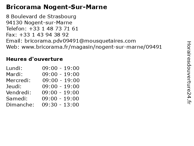 1 Bricorama (Distance: 2,30 km) 21 Avenue Du Maréchal De Lattre De Tassigny, 94120 Fontenay Sous Bois brico, bricorama, decoration, jardin, mobilier 2 Bricorama (Distance: 4,27 km) 21 Boulevard Jean Monnet, 94350 Villiers Sur Marne brico, bricorama, decoration, jardin, mobilier 3 Bricorama Saint-Maur-Des-Fossés (Distance: 4,39 km) 12 Rue Baratte Cholet, 94100 Saint-Maur-des-Fossés bricorama, des, fossés, maur, saint 4 Bricorama (Distance: 6,41 km) 12 Quai Marcel Boyer, 94204 Ivry Sur Seine brico, bricorama, decoration, jardin, mobilier 6 |