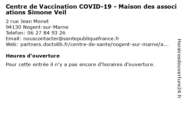 1 Centre de Vaccination COVID-19 - Annexe du Collège International (Distance: 3,36 km) 1 Allée Christophe Colomb, 93160 Noisy-le-Grand 19, annexe, centre, collège, covid, covid 19, covid19, de, du, international, médecin, médecine, médical, test, vaccin, vaccination, vaccins 2 Centre de Vaccination COVID-19 - Salle des fêtes Marcel Pagnol (Distance: 4,21 km) 3 rue de Berry, 93330 Neuilly-sur-Marne 19, centre, covid, covid 19, covid19, de, des, fêtes, marcel, médecin, médecine, médical, pagnol, salle, test, vaccin, vaccination, vaccins 3 Centre de Vaccination COVID-19 (Distance: 4,28 km) 10 Avenue Gambetta, 94100 Saint-Maur-des-Fossés 19, centre, covid, covid 19, covid19, de, médecin, médecine, médical, test, vaccin, vaccination, vaccins 4 Centre de Vaccination COVID-19 (Distance: 5,06 km) 4 Avenue Pasteur, 94160 Saint-Mandé 19, centre, covid, covid 19, covid19, de, médecin, médecine, médical, test, vaccin, vaccination, vaccins 5 Centre de Vaccination COVID-19 - Centre de Santé Bauchat-Nation (Distance: 7,35 km) 22 Rue du Sergent Bauchat, 75012 Paris 19, bauchat, centre, covid, covid 19, covid19, de, médecin, médecine, médical, nation, santé, test, vaccin, vaccination, vaccins 6 Carrefour des Associations Parisiennes (Distance: 7,38 km) 181 avenue Daumesnil, 75012 Paris associations, carrefour, des, equipement, joyeuse, l'heure, livre, maison des associations, médiathèque, parisiennes, services |