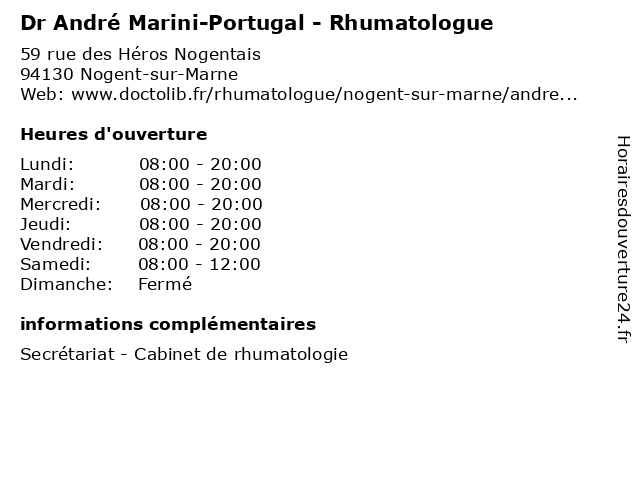 1 Dr Marc Ghezail - Rhumatologue (Distance: 3,93 km) 7 Place Carnot, 93110 Rosny-sous-Bois dr, ghezail, marc, rhumatisme, rhumatologue, sante, soins 2 Dr Cécile Borget - Rhumatologue (Distance: 4,41 km) 67 Avenue de la République, 94100 Saint-Maur-des-Fossés borget, cecile, cécile, dr, rhumatisme, rhumatologue, sante, soins 3 Dr Cécile Hassan - Rhumatologue (Distance: 4,41 km) 67 Avenue de la République, 94100 Saint-Maur-des-Fossés cecile, cécile, dr, hassan, rhumatisme, rhumatologue, sante, soins 4 André (Distance: 4,48 km) - Zac Centre Urbain Régional de Noisy, 93160 Noisy-le-Grand accessoires, andré, chaussure, chaussures, mode 5 Centre hospitalier intercommunal André Grégoire (Distance: 5,06 km) 56 Boulevard de la Boissiere, 93105 Montreuil-sous-Bois andré, centre, docteur, grégoire, hospitalier, intercommunal, medecins, sante 6 CHI André Gregoire (secrétariat ) (Distance: 5,06 km) 56 Boulevard de la Boissière, 93100 Montreuil andré, chi, consultation, docteur, gregoire, médecins, santé, secrétariat |