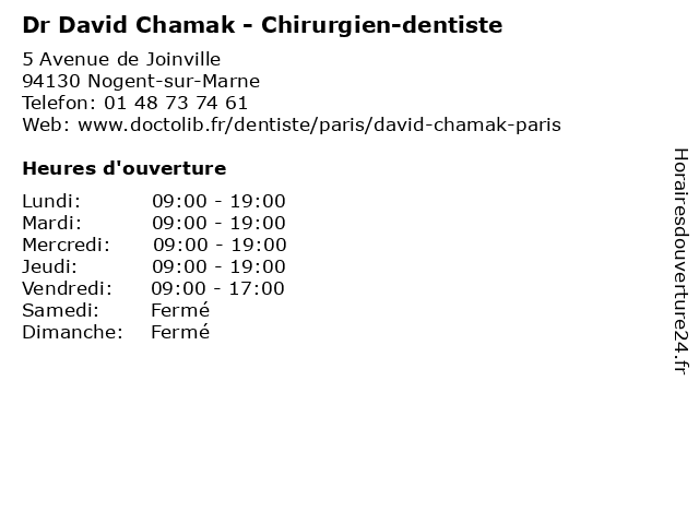 1 Dr David Chamak - Chirurgien-dentiste (Distance: 0,00 km) 5 Avenue de Joinville, 94130 Nogent-sur-Marne chamak, chirurgien, consultation, david, dentiste, docteur, dr, med, médecin, médecine, secrétariat, traitement 2 Dr David Chamak - Chirurgien-dentiste (Distance: 0,08 km) 5 Avenue de Joinville, 94130 Nogent-sur-Marne chamak, chirurgien, david, dentaire, dentiste, dr, implantologie, parodontologie 3 Jeans Louis David (Distance: 5,90 km) 4 Place de L' Europe, 94220 Charenton-le-Pont alimentation, beauté & santé, culture & loisirs, david, enfants, high-tech, jeans, louis, maison & déco, mode, restaurants 4 Jean Louis David (Distance: 10,08 km) 60 rue Saint Stenay, 93700 Drancy alimentation, beauté & santé, culture & loisirs, david, enfants, high-tech, jean, louis, maison & déco, mode, restaurants 5 Jean Louis David (Distance: 11,16 km) . Rue Monthéty, 77340 Pontault-Combault alimentation, beauté & sante, culture & loisirs, david, enfants, high-tech, jean, louis, maison & déco, mode, restaurants 6 Maître Elie Chamak - Avocat (Distance: 12,39 km) 4 Rue du General Foy, 75008 Paris avocat, avocats, cabinet, chamak, conseils, contentieux, elie, juridique, justice, litiges, maître, services |