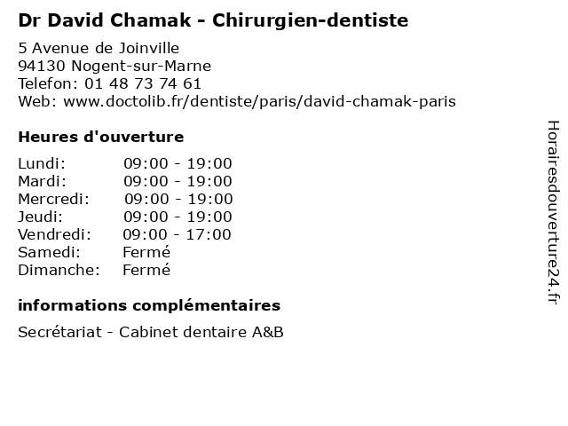 1 Dr David Chamak - Chirurgien-dentiste (Distance: 0,08 km) 5 Avenue de Joinville, 94130 Nogent-sur-Marne chamak, chirurgien, consultation, david, dentiste, docteur, dr, med, médecin, médecine, secrétariat, traitement 2 Dr David Chamak - Chirurgien-dentiste (Distance: 0,08 km) 5 Avenue de Joinville, 94130 Nogent-sur-Marne chamak, chirurgien, david, dentiste, dr, médecin, médecine, médical, pharmaceutique, secrétariat, traitement 3 Dr David Kenzey - Chirurgien-dentiste - secrétariat (Distance: 0,02 km) 5 Avenue de Joinville, 94130 Nogent-sur-Marne chirurgien, chirurgien-dentiste, david, dentiste, dr, kenzey, médecins, médicaments, santé, secrétariat, spécialiste 5 Dr John-David Rebibo - Chirurgien urologue (Distance: 0,14 km) 3-5 Avenue Watteau, 94130 Nogent-sur-Marne chirurgien, consultation, david, docteur, dr, john, med, médecin, médecine, rebibo, secrétariat, traitement, urologue 6 Dr David Zanditenas - Gastro-entérologue et hépatologue - secrétariat (Distance: 4,03 km) 2 Rue des Pères Camilliens, 94360 Bry-sur-Marne consultation, david, docteur, dr, entérologue, et, gastro, hépatologue, med, médecin, médecine, secrétariat, traitement, zanditenas |