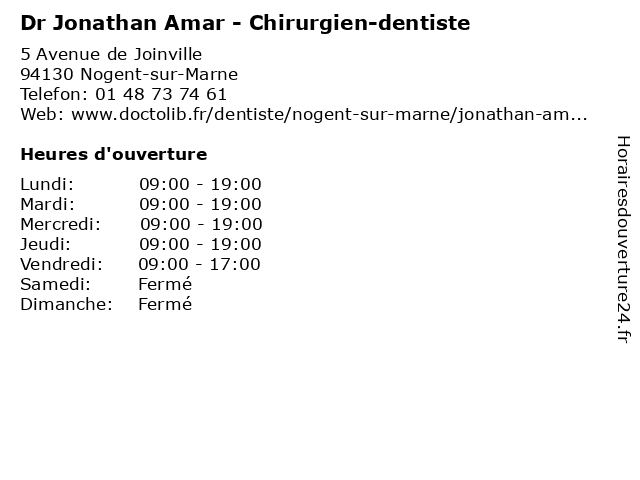 | 1 Dr Jonathan Amar - Chirurgien-dentiste (Distance: 16,25 km) 142 Avenue Charles de Gaulle, 92200 Neuilly-sur-Seine amar, chirurgien, chirurgien-dentiste, dentiste, dr, jonathan, médecins, médicaments, santé, secrétariat, spécialiste 2 Dr Noemie Amar - Médecin généraliste (Distance: 0,00 km) 5 bis avenue de Joinville, 94130 Nogent-sur-Marne amar, docteur, dr, generaliste, généraliste, medecin, médecin, noemie, soins 3 Dr Myriam Bouzaglou-Amar - Chirurgien-dentiste (Distance: 0,00 km) 5 Avenue de Joinville, 94130 Nogent-sur-Marne amar, bouzaglou, chirurgien, dent, dentiste, docteur, dr, myriam, soins 4 Dr Jonathan Catry - Chirurgien viscéral et digestif (Distance: 0,14 km) 3 Avenue Watteau, 94130 Nogent-sur-Marne catry, chirurgie, chirurgien, digestif, dr, et, general, jonathan, soins, viscéral 5 Entreprise Jonathan (Distance: 0,88 km) 27 rue Paul Bert, 94130 Nogent-sur-Marne artisan, couverture, entreprise, jonathan, nettoyage de, toiture 6 Jonathan Triolaire - Kinésiologue (Distance: 1,57 km) 188 Grande Rue Charles de Gaulle, 94130 Nogent-sur-Marne consultation, docteur, jonathan, kinésiologue, med, médecin, traitement, triolaire |