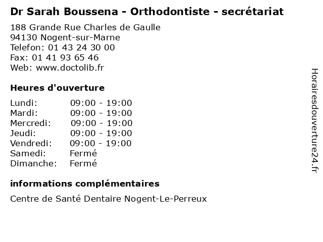 1 Dr Sarah Boussena - Orthodontiste - secrétariat (Distance: 0,00 km) 188 Grande Rue Charles de Gaulle, 94130 Nogent-sur-Marne boussena, consultation, docteur, dr, med, médecin, médecine, orthodontiste, sarah, secrétariat, traitement 2 Centre de santé Ivry sur seine - Orthodontiste (Distance: 8,11 km) 64 Avenue Georges Gosnat, 94200 Ivry sur seine bureau, centre, consultation, de, dr, ivry, maladie, med, médecin, médecine, orthodontiste, pratique, santé, seine, sur, thérapie, traitement 3 Dr.Chatelain Anne Marie- Orthodontiste (Distance: 12,70 km) 31-33 Rue Caumartin, 75009 Paris anne, docteur, dr.chatelain, marie, medecins, orthodontiste, sante 4 Dr.Lenchner Lisa - Orthodontiste (Distance: 12,70 km) 31-33 Rue Caumartin, 75009 Paris docteur, dr.lenchner, lisa, medecins, orthodontiste, sante 5 Dr. Bouan du Chef du Bois Anne - Orthodontiste (Distance: 15,30 km) 12 Avenue de la Grande Armée, 75017 Paris anne, bois, bouan, chef, docteur, dr., du, medecins, orthodontiste, sante 6 Dr. Flitti Sabrina - Orthodontiste (Distance: 15,30 km) 12 Avenue de la Grande Armée, 75017 Paris docteur, dr., flitti, medecins, orthodontiste, sabrina, sante |