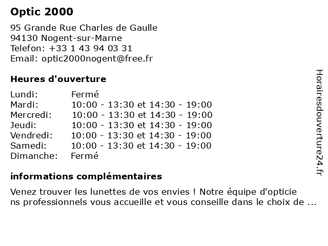 2 Optic 2000 (Distance: 2,58 km) 11 Boulevard Maréchal, 35300 Fougères 2000, lunettes, optic, santé, solaires 3 Optic 2000 (Distance: 3,18 km) 88 Rue Jean Jaures, 94500 Champigny Sur Marne 2000, accessoires, lentilles, lunettes, montures, optic, optic 2000, opticien, solaire, verres, vision, vue 4 Optic 2000 (Distance: 4,19 km) 38 Boulevard Rouget de Lisle, 93100 Montreuil 2000, lunettes, optic, santé, solaires 5 Optic 2000 (Distance: 4,57 km) 234 Boulevard du Mont d'Est, 93193 Noisy-le-Grand 2000, alimentation, beauté & santé, culture & loisirs, enfants, high-tech, maison & déco, mode, optic, restaurants 6 |