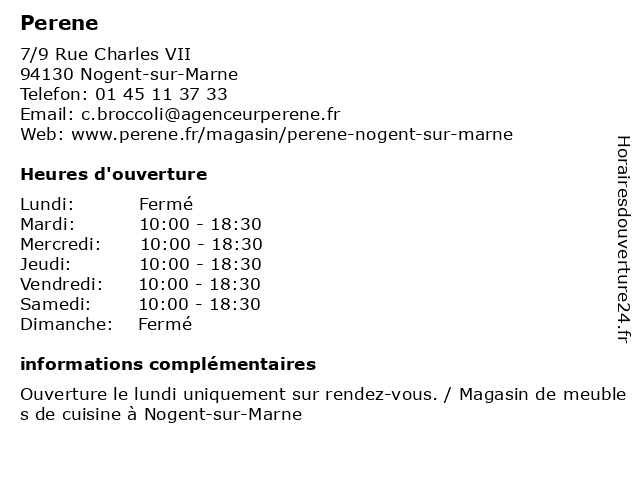 2 Perene (Distance: 4,70 km) 29 Avenue du Bac, 94210 La Varenne-Saint-Hilaire bain, cuisine, perene, services 3 Perene (Distance: 5,02 km) 29 Avenue Général de Gaulle, 94160 Saint Mandé agencement, cuisines, d’intérieur, perene, sales de bains 5 Perene (Distance: 13,01 km) 101 Boulevard Haussmann, 75008 Paris aménagements, cuisines, magasin, maisons, perene, salles de bains 6 |