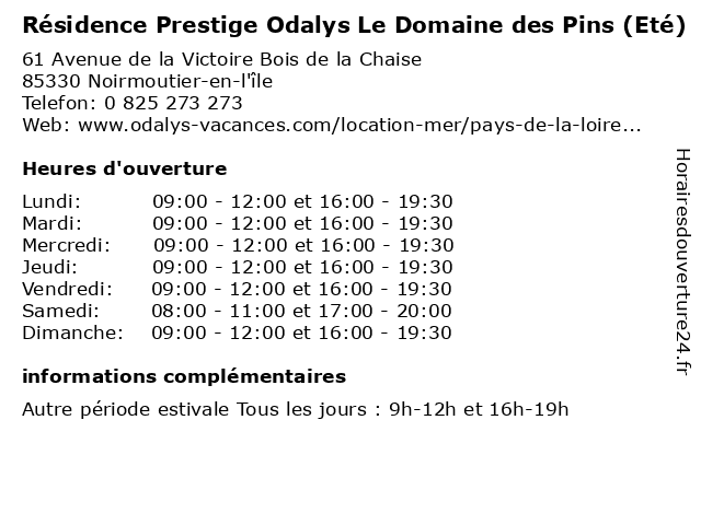 1 Résidence Prestige Odalys Le Domaine des Pins (Hiver) (Distance: 0,00 km) 61 Avenue de la Victoire Bois de la Chaise, 85330 Noirmoutier-en-l'île de, des, domaine, hiver, le, location, maison, odalys, personnes, pins, prestige, retraite, résidence, vacances 2 Domaine Des Roussières SARL (Distance: 1,33 km) 15 Rue des Grandes Roussieres, 85330 Noirmoutier-en-l'Île des, domaine, roussières, sarl 3 Sealand Aquarium - Eté (Distance: 1,69 km) 5 rue de l'Ecluse, 85330 Noirmoutier-en-l'Ile aquarium, découverte, eté, poissons, sealand, sortie, visite, été 4 Camping Sandaya Domaine Le Midi (Distance: 7,93 km) Rue du Camping, 85630 Barbâtre camping, domaine, le, midi, sandaya 5 Hotel Résidence Maeva Le Hameau Du Golf (Distance: 14,70 km) . Avenue de Scalby Newby, 44210 Pornic bar, du, golf, hameau, hotel, hotel.restaurant, le, maeva, résidence, service 6 Éco-Domaine la Fontaine (Distance: 16,03 km) Rue des Noëlles, 44210 Pornic domaine, fontaine, la, éco |
