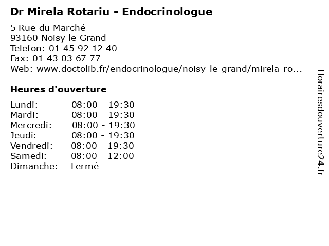 1 Dr Mathilde Lafont - Endocrinologue (Distance: 0,00 km) 5 Rue du Marché, 93160 Noisy le Grand dr, endi, endocrinologue, lafont, mathilde, medecin, sante 2 Dr Mirela Rotariu - Endocrinologue - secrétariat (Distance: 2,50 km) 2 Rue des Pères Camilliens, 94360 Bry-sur-Marne consultation, docteur, dr, endocrinologue, med, mirela, médecin, médecine, rotariu, secrétariat, traitement 3 Dr Laurence Chotard - Endocrinologue - secrétariat (Distance: 5,07 km) 22 Boulevard Gallieni,, 94130 Nogent-sur-Marne chotard, dr, endocrinologue, laurence, médecins, médicaments, santé, secrétariat, spécialiste 4 Dr Raluca-Costina Dina - Endocrinologue (Distance: 7,12 km) 63 Avenue de Sévigné, 93390 Clichy-sous-Bois costina, dina, dr, endocrinologue, médecins, raluca, santé, spécialiste 5 Dr Muriel Sitbon - Endocrinologue (Distance: 8,49 km) - Avenue du 14 Juillet, 93140 Bondy dr, endocrinologue, muriel, médecins, médicaments, santé, secrétariat, sitbon, spécialiste 6 Dr Anne Dierick-Gallet - Endocrinologue (Distance: 11,49 km) 11 Place de la Nation, 75011 Paris anne, dierick, dr, endocrinologue, gallet, médecins, santé, spécialiste |
