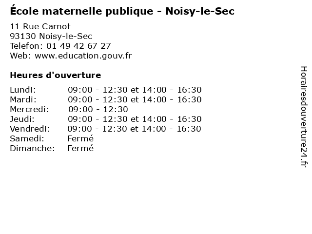 1 École maternelle publique - Noisy-le-Sec (Distance: 0,37 km) 14 Rue P Brossolette, 93130 Noisy-le-Sec ecole, education, le, maternelle, noisy, publique, sec, services, école 2 École maternelle publique - Noisy-le-Sec (Distance: 0,46 km) 80 Rue Marceau, 93130 Noisy-le-Sec ecole, education, le, maternelle, noisy, publique, sec, services, école 3 École maternelle publique - Noisy-le-Sec (Distance: 0,64 km) 1 Rue Cottereau, 93130 Noisy-le-Sec ecole, education, le, maternelle, noisy, publique, sec, services, école 4 École maternelle publique - Noisy-le-Sec (Distance: 1,32 km) 115 Rue de l'Avenir, 93130 Noisy-le-Sec ecole, education, le, maternelle, noisy, publique, sec, services, école 5 École primaire publique - Noisy-le-Sec (Distance: 0,00 km) 11 Rue Carnot, 93130 Noisy-le-Sec ecole, education, le, maternelle, noisy, primaire, publique, sec, services, école 6 Auto-Ecole CER Perrine (Distance: 0,11 km) 61 Rue Jean Jaurès, 93130 Noisy-le-Sec auto, auto école, cer, conduite, cours, de, ecole, instructeurs, permis, perrine |