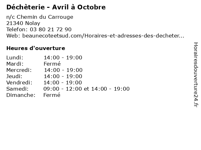 1 Déchèterie - Avril à Octobre (Distance: 12,32 km) - Chemin Champs Lin, 21190 Meursault avril, bennes, débarras, déchèterie, détritus, octobre, ordures, poubelles 2 Déchèterie - Avril à Octobre (Distance: 18,93 km) n/c route de Bouze-les-Beaune, 21420 Savigny-les-Beaune avril, bennes, débarras, déchèterie, détritus, octobre, ordures, poubelles 3 Déchèterie - Novembre à Mars (Distance: 0,00 km) n/c Chemin du Carrouge, 21340 Nolay bennes, débarras, déchèterie, détritus, mars, novembre, ordures, poubelles 4 Office de Tourisme - Avril à Mai et Octobre (Distance: 7,06 km) - Gare SNCF, 21590 Santenay 1er, 31, au, avril, boutique, brochures, cartes, circuits, de, et, informations, mai, octobre, office, tourisme 5 Déchèterie - Novembre à Mars (Distance: 12,32 km) - Chemin Champs Lin, 21190 Meursault bennes, débarras, déchèterie, détritus, mars, novembre, ordures, poubelles 6 Office de Tourisme(Point 1) - Avril à Mai et Octobre (Distance: 17,51 km) - Rue de l'Hôtel Dieu, 21200 Beaune 1er, 31, au, avril, boutique, brochures, cartes, circuits, de, et, informations, mai, octobre, office, point, tourisme |