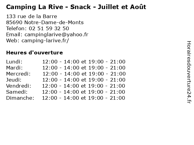 1 Camping La Rive - Juillet à Septembre (Distance: 0,00 km) 133 rue de la Barre, 85690 Notre-Dame-de-Monts accueil, camping, caravaning, de, juillet, la, loisirs, rive, septembre, tourisme, vacances 2 Camping La Rive - Épicerie - Juillet et Août (Distance: 0,00 km) 133 rue de la Barre, 85690 Notre-Dame-de-Monts août, camping, caravaning, en, et, juillet, la, loisirs, rive, tourisme, vacances, Épicerie 3 Camping La Rive - Bar - Juillet et Août (Distance: 0,00 km) 133 rue de la Barre, 85690 Notre-Dame-de-Monts août, bar, camping, caravaning, en, et, juillet, la, loisirs, rive, tourisme, vacances 4 Camping Le Grand Jardin - Juillet et Août (Distance: 2,71 km) 50 rue de la Barre, 85690 Notre-Dame-de-Monts août, camping, caravaning, en, et, grand, jardin, juillet, le, loisirs, réception, tourisme, vacances 5 Camping Le Clos du Bourg - juillet-août (Distance: 3,29 km) 12 Rue du Perrier, 85690 Notre-Dame-de-Monts août, bar, bourg, café, camping, clos, dame, de, du, fraicheur, juillet, le, monts, notre, restaurants, étoiles 6 Mediatheque Espace Culturel (1er lundi de Juillet au dernier samedi d'Août) (Distance: 8,96 km) . Boulevard Maréchal Leclerc, 85160 Saint-Jean-de-Monts 1er, au, culturel, d'août, de, dernier, documents, espace, informations, juillet, lundi, mediatheque, samedi |
