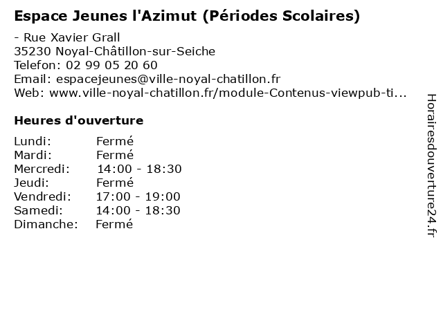 1 Espace Jeunes l'Azimut (Vacances Scolaires) (Distance: 0,00 km) - Rue Xavier Grall, 35230 Noyal-Châtillon-sur-Seiche activités, espace, jeunes, l'azimut, loisirs, scolaires, vacances 2 Centre Culturel Le Volume (Périodes Scolaires) (Distance: 5,01 km) 3 Rue François Rabelais, 35770 Vern-sur-Seiche activités, centre, culturel, le, périodes, scolaires, volume, Évènements 3 Centre Culturel Le Volume (Petites Vacances Scolaires) (Distance: 5,01 km) 3 Rue François Rabelais, 35770 Vern-sur-Seiche activités, centre, culturel, le, petites, scolaires, vacances, volume, Évènements 4 Bibliothèque Espace lecture - Carrefour 18 (Distance: 5,49 km) 7 Rue d'Espagne, 35200 Rennes 18, bibliothèque, carrefour, espace, lecture, livre, médiathèque, services 5 Local Jeunes (Périodes Scolaires) (Distance: 6,54 km) - Rue de la Mairie, 35230 Saint-Armel activités, espace, jeunes, local, loisirs, période, périodes, scolaire, scolaires 6 Local Jeunes (Vacances Scolaires) (Distance: 6,54 km) - Rue de la Mairie, 35230 Saint-Armel activités, espace, jeunes, local, loisirs, scolaires, vacances |
