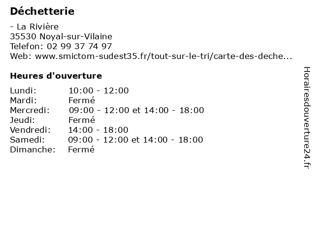 2 Déchetterie (Distance: 6,84 km) - Zone de la Goulgatière, 35220 Châteaubourg decheterie, déchetterie, smictom 5 Déchetterie (Distance: 18,92 km) - ZI de Chedeville, 35140 St Aubin du Cormier decheterie, déchetterie, smictom 6 |