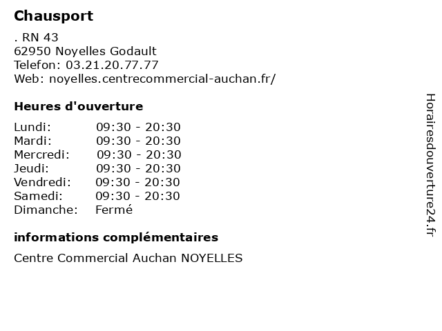 2 Chausport (Distance: 0,97 km) - Route Nationale 43, 62950 Noyelles-Godault chausport, chaussures, mode 6 Chausport (Distance: 19,77 km) 43 Route Nationale, 62950 Noyelles auchan, centre, chausport, commercial, noyelles |