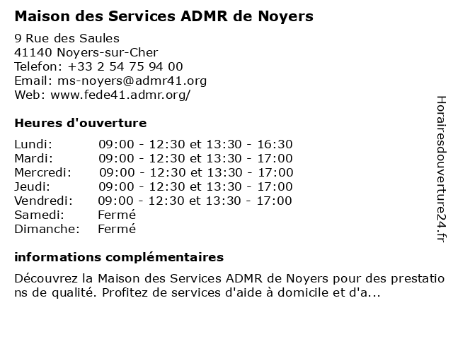 1 Maison des Services ADMR de Vernou en Sologne (Distance: 7,64 km) 40 Bis Rue des Marnières, 41230 Vernou-en-Sologne admr, de, des, en, maison, services, sologne, vernou 2 Maison des Services ADMR des Romorantin (Distance: 11,16 km) 9 Quai de l'Île Marin, 41200 Romorantin-Lanthenay admr, des, maison, romorantin, services 3 Maison des Services ADMR de Saint-Julien-sur-Cher (Distance: 19,44 km) 1 Rue de Valette, 41320 Saint-Julien-sur-Cher admr, cher, de, des, julien, maison, saint, services, sur 4 Maison des Services ADMR de Salbris (Distance: 21,58 km) 33 Rue de la Victoire, 41300 Salbris admr, de, des, maison, salbris, services 5 Maison des Services ADMR de Contres (Distance: 24,65 km) 9 Rue des Aulnes, 41700 Le Controis-en-Sologne admr, contres, de, des, maison, services 6 Maison des Services ADMR de Mer (Distance: 33,92 km) 32 Rue Haute d'Aulnay, 41500 Mer admr, de, des, maison, mer, services |