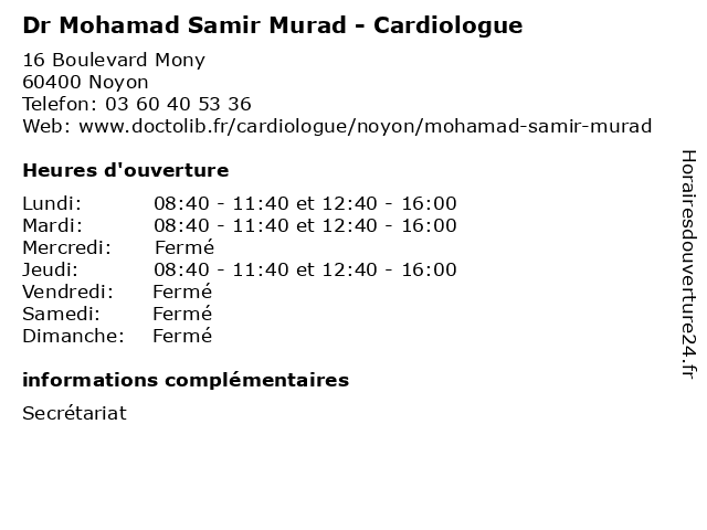 Termes de recherche pour Dr Mohamad Samir Murad - Cardiologue:noyon, dr, murad, cardiologue, samir, mohamad, 60400, dr mohamad |