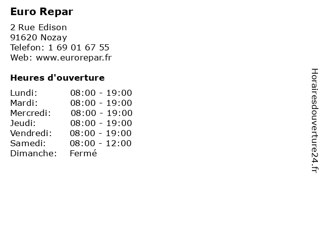1 Euro Repar (Distance: 3,61 km) 2 Rue Marie Curie, 91700 Villiers Sur Orge automobiles, euro, location de voiture, location de véhicules, motos, repar 2 Euro Repar (Distance: 5,69 km) 55 Rue Edouard Danaux, 91220 Bretigny sur Orge automobiles, euro, location de voiture, location de véhicules, motos, repar 3 Euro Repar (Distance: 8,27 km) 79 Route De Dourdan, 91520 Egly automobiles, euro, location de voiture, location de véhicules, motos, repar 4 Euro Repar (Distance: 18,89 km) . Les Sausses, 12200 Martiel automobiles, euro, location de voiture, location de véhicules, motos, repar 5 Euro Repar (Distance: 19,49 km) 17 Rue Lech Walesa, 94270 Le Kremlin Bicetre automobiles, euro, location de voiture, location de véhicules, motos, repar 6 Euro Repar (Distance: 19,52 km) 58 Avenue Jean Jaures, 94100 Vitry sur Seine automobiles, euro, location de voiture, location de véhicules, motos, repar |