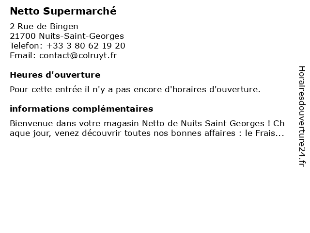 1 Supermarché Colruyt (Distance: 0,01 km) 2 Rue de Bingen, 21700 Nuits-Saint-Georges aliment, alimentaire, alimentation, biere, bieres, boucher, boucherie, boulangerie, charcuterie, colruyt, courses, diesel, essence, fruits, gazoil, legumes, magasin, marche, pain, sandwich, supermarché 3 Casino Supermarché (Distance: 15,78 km) 28 Rue du Faubourg Madeleine, 21200 Beaune alimentaire, alimentation, casino, courses, distributeur, hypermarché, super, supermarché, épicerie 6 Netto (Distance: 15,90 km) - Route de Dijon, 21110 Aiserey achats de produits alimentaires, des prix bas, grands supermarchés, hard discount, netto, supermarchés |