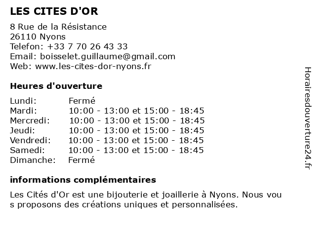| Mardi | 10:00-13:00 et 15:00-18:45 |