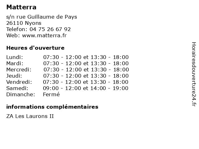 | Vendredi | 07:30-12:00 et 13:30-18:00 |