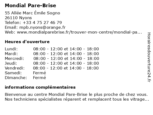 1 Mondial Pare-Brise - Les 2 A Auto sas (Distance: 0,25 km) Rue des Laurons, 26110 Nyons auto, brise, les, mondial, pare, sas 3 France Pare Brise (Distance: 10,98 km) 62 Cours Victor Hugo, 84600 Valréas bris de glace, brise, france, pare, services 4 L EPICERIE DU CHATEAU (Distance: 23,18 km) 384 Avenue des Côtes du Rhône, 26790 Suze-la-Rousse charcuteries et fromages locaux et régionaux, chateau, du, dépôt de gaz, epicerie, fruits et légumes en circuit court, point mondial relay, traiteur, épicerie dans la drôme 5 MONDIAL PARE BRISE - LES 2 A AUTO SAS (Distance: 32,54 km) 15 Rue du Gardon, 26700 Pierrelatte auto, brise, les, mondial, pare, sas 6 La Maison d'Ursule (Distance: 34,03 km) - Rue d'Italie, 84100 Orange coudre, couture, d'ursule, décoration, intérieure, la, linge, maison, mercerie, mode, mondial, tissus |